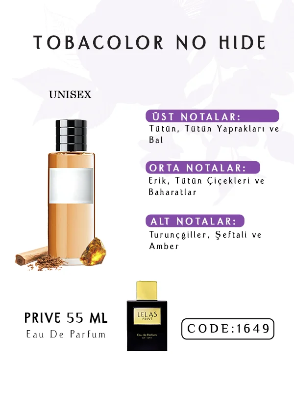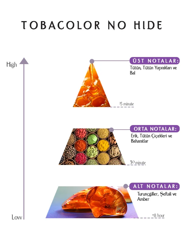 Tobacolor No Hide Parfüm, güç ve gizem yoluyla özgüvenini ifade eden kişiler için tasarlanmıştır. Bazı cilt tiplerinde tütün ve bal dumanlı tatlılıkla öne çıkarken; bazılarında erik, baharatlar ve amber daha derin bir sofistike etki yaratır.