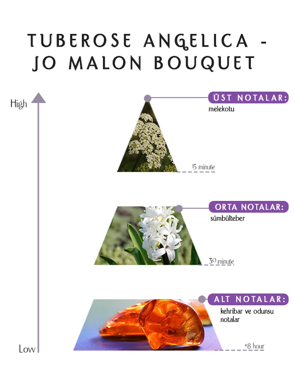 Doğadan ve rafine cazibeden ilham alan bu parfüm; meyvemsi canlılıktan çiçeksi inceliğe ve sonrasında topraksı duyusallığa geçiş yapar. Tuberose Angelica Jomalon Bouquet zarif bir şekilde gelişerek hem modern hem de zamansız bir koku yolculuğu sunar. Katmanlı yapısı sayesinde her aşama farklı bir hikâye anlatır, kullanıcıyı büyüler ve çevresindekileri etkiler.
